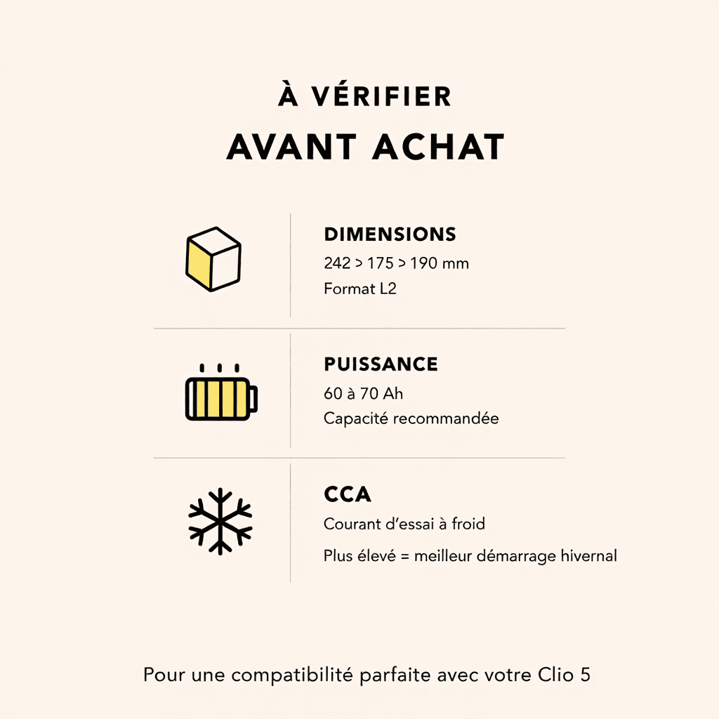 Les Clio acceptent souvent 60Ah ou 70Ah selon l’équipement. Plus d’Ah signifie plus d’autonomie pour l’électronique mais attention au système de charge.